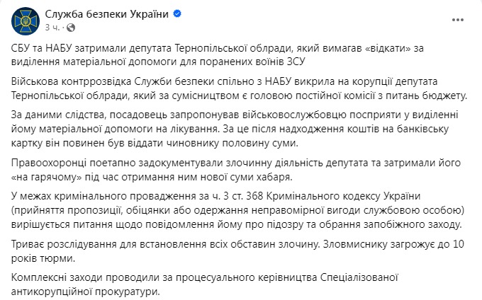 Служба безопасности Украины (СБУ) и Национальное антикоррупционное бюро (НАБУ) разоблачили на коррупции депутата Тернопольского облсовета Олега Щиголя, который по совместительству является председателем постоянной комиссии по бюджету. По данным следствия, депутат требовал откат за выделение материальной помощи для раненых воинов ВСУ.
