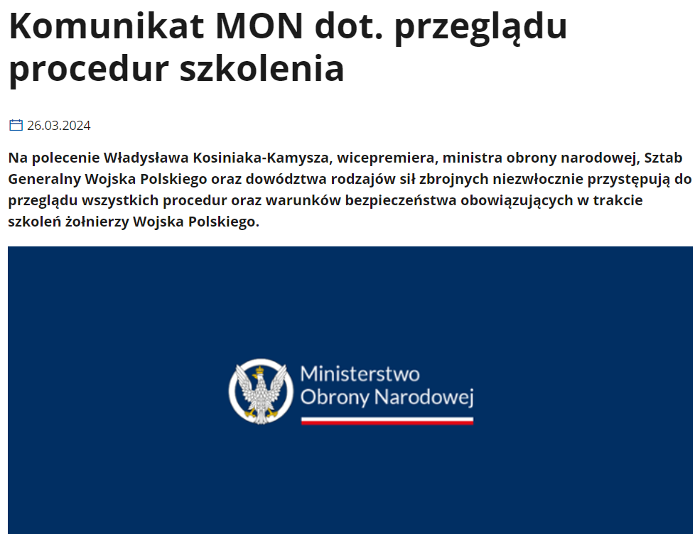 "По решению министра обороны Владислава Косиняка-Камыша генеральный штаб Войска польского и командование вооруженных сил немедленно пересмотрят все процедуры и условия обеспечения безопасности, применяющиеся при обучении польских военнослужащих. До завершения проверки приостанавливается подготовка польских солдат с использованием взрывчатых и боевых отравляющих веществ", - говорится в сообщении.