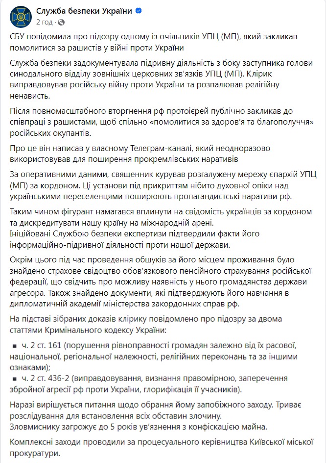 После полномасштабного вторжения России протоиерей публично призвал к сотрудничеству с рашистами, чтобы совместно «помолиться за здоровье и благополучие» российских оккупантов. Об этом он написал в собственном телеграм-канале, который неоднократно использовал для распространения прокремлевских нарративов", - заявили в СБУ.