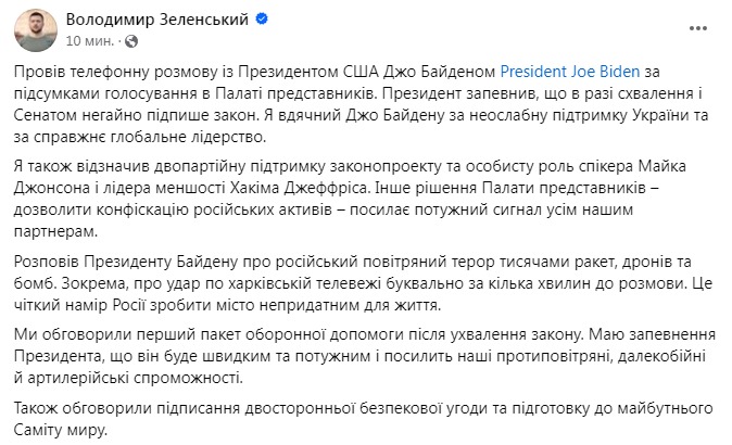 Владимир Зеленский провел телефонный разговор с президентом США Джо Байденом по итогам голосования в Палате представителей о выделении помощи Украине.