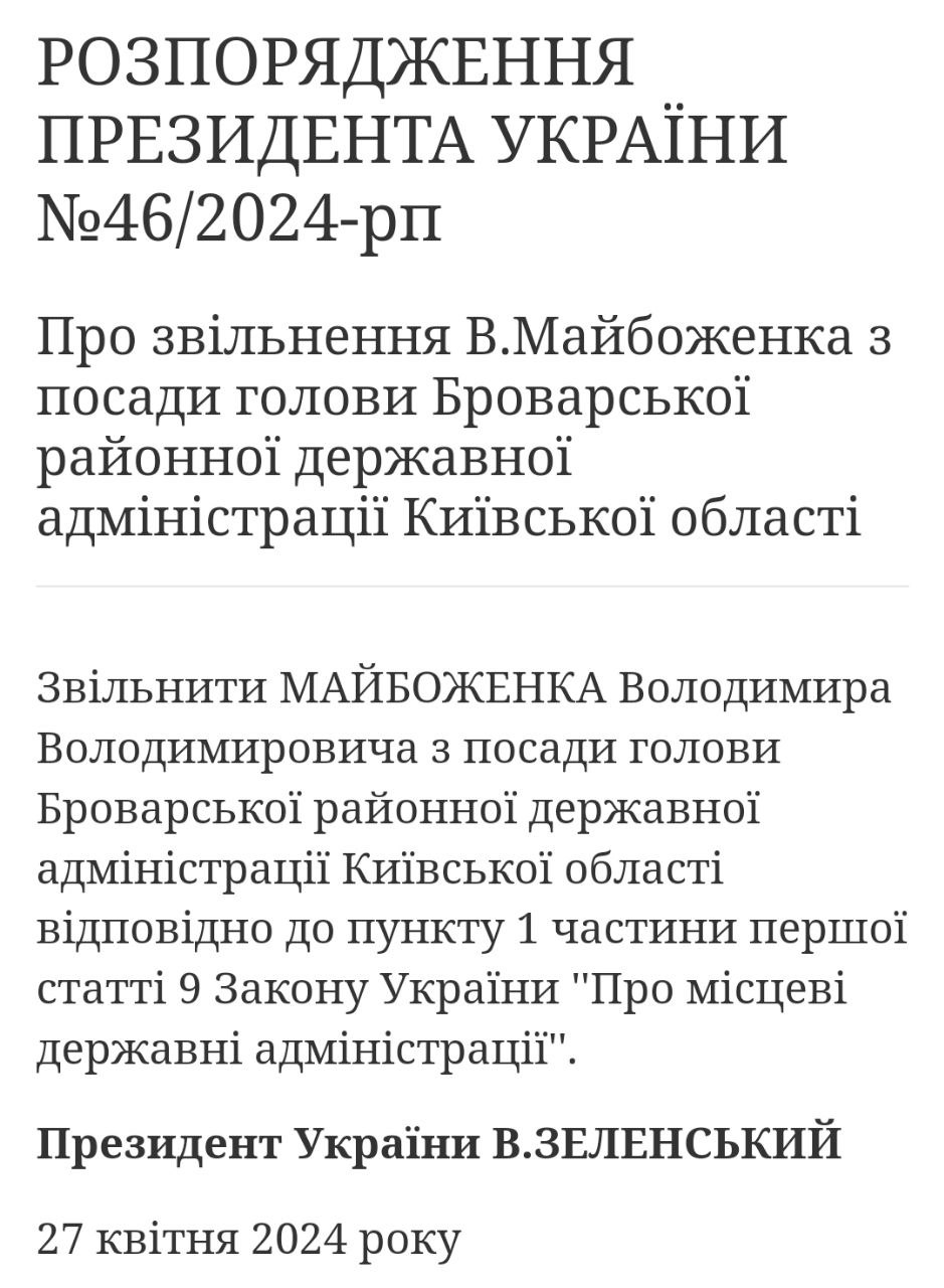 Майбоженко уволен с должности главы Броварской районной государственной администрации Киевской области в соответствии с пунктом 1 части первой статьи 9 Закона Украины ''О местных государственных администрациях''.