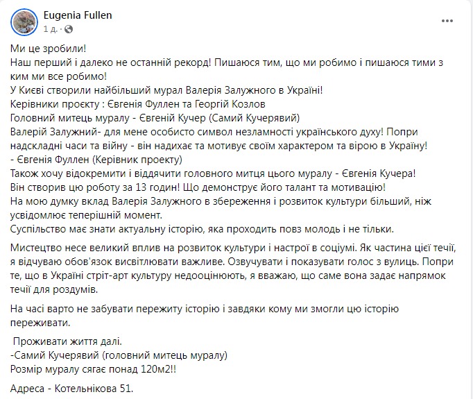 "По моему мнению, вклад Валерия Залужного в сохранение и развитие культуры больше, чем осознает нынешний момент. Общество должно знать актуальную историю, которая проходит мимо молодежи и не только. Искусство оказывает большое влияние на развитие культуры и настроения в социуме. Как часть этого течения я чувствую обязанность освещать важное. Озвучивать и показывать голос с улиц. Несмотря на то, что в Украине стрит-арт культуру недооценивают, я считаю, что именно она задает направление размышления", - написала Фуллен.