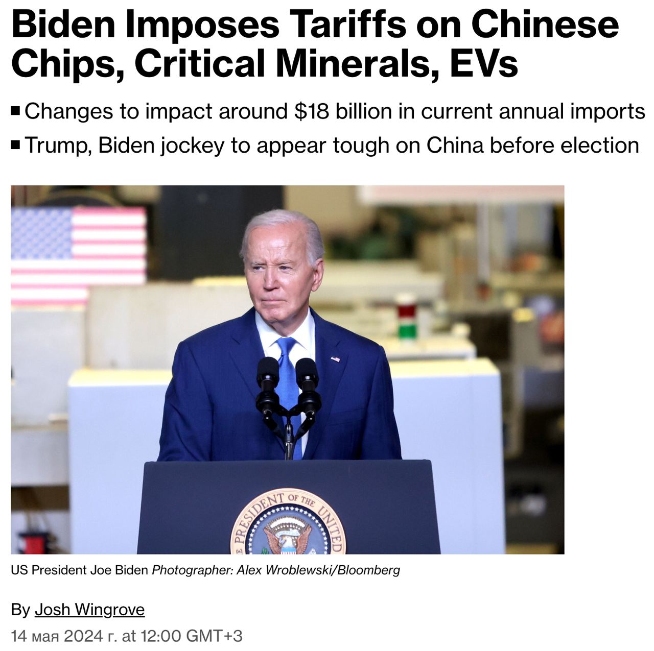 Президент США Джо Байден утвердил повышение тарифов на китайские полупроводники, батареи, солнечные батареи, критически важные минералы, портовые краны, медицинские товары и другие товары.