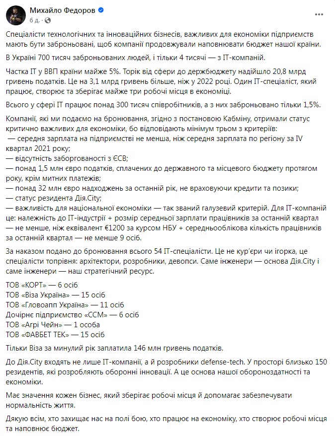 "Специалисты технологических и инновационных бизнесов, важных для экономики предприятий, должны быть забронированы, чтобы компании продолжали наполнять бюджет нашей страны. В Украине 700 тысяч забронированных людей, и только 4 тысячи из IT-компаний. Доля IT в ВВП страны почти 5%. В прошлом году от сферы в госбюджет поступило 20,8 млрд гривен налогов. Это на 3,1 млрд гривен больше, чем в 2022 году. Один работающий IT-специалист создает и сохраняет почти три рабочих места в экономике", - сказано в посте чиновника.