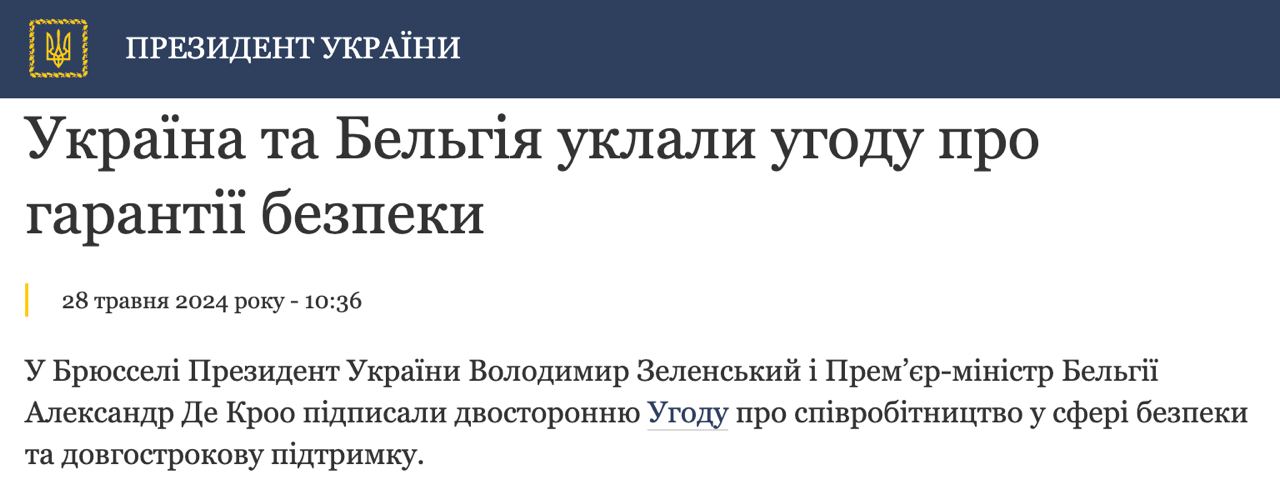 Сегодня, 27 мая, президент Украины Владимир Зеленский в Брюсселе подписал документ с премьером Бельгии Александр Де Кро "соглашение о гарантиях безопасности"