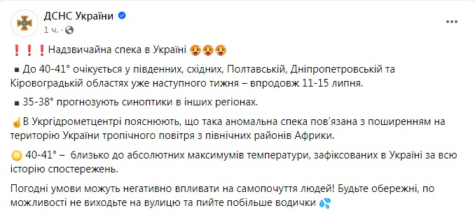 "До +40...+41° ожидается в южных, восточных, Полтавской, Днепропетровской и Кировоградской областях уже на следующей неделе – 11-15 июля. В других регионах +35...+38°", - сообщили в ГСЧС.