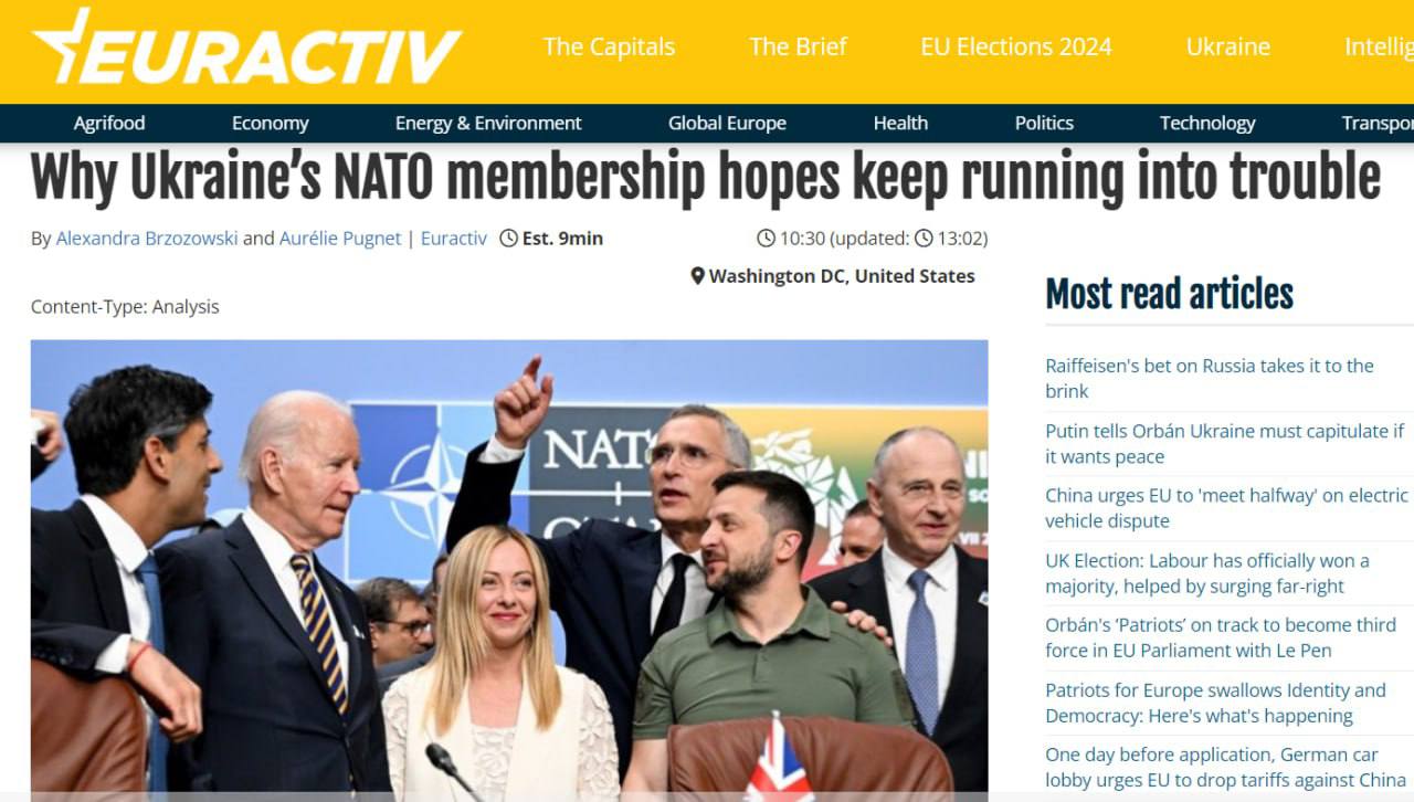 Издание пишет, что украинские официальные лица в частном порядке признают, что не ожидают приглашения вступить в НАТО на этом саммите или в ближайшем будущем, но Киев рассчитывал "как минимум" на более жесткие формулировки в Вашингтоне.
