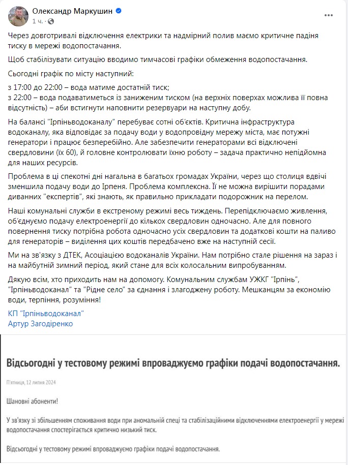 "Из-за долговременных отключений электричества и чрезмерного полива имеем критическое падение давления в сети водоснабжения. Чтобы стабилизировать ситуацию, вводим временные графики ограничения водоснабжения", - написал градоначальник.