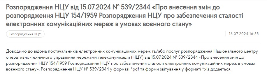 В документе под названием "О внесении изменений в распоряжение НЦУ 154/1959 об обеспечении постоянства электронных коммуникационных сетей в условиях военного положения", датированном 15 июля, поручается обеспечить работоспособность электронных коммуникационных сетей в условиях планового, аварийного, незапланированного и/или вынужденного подключения электроснабжения: