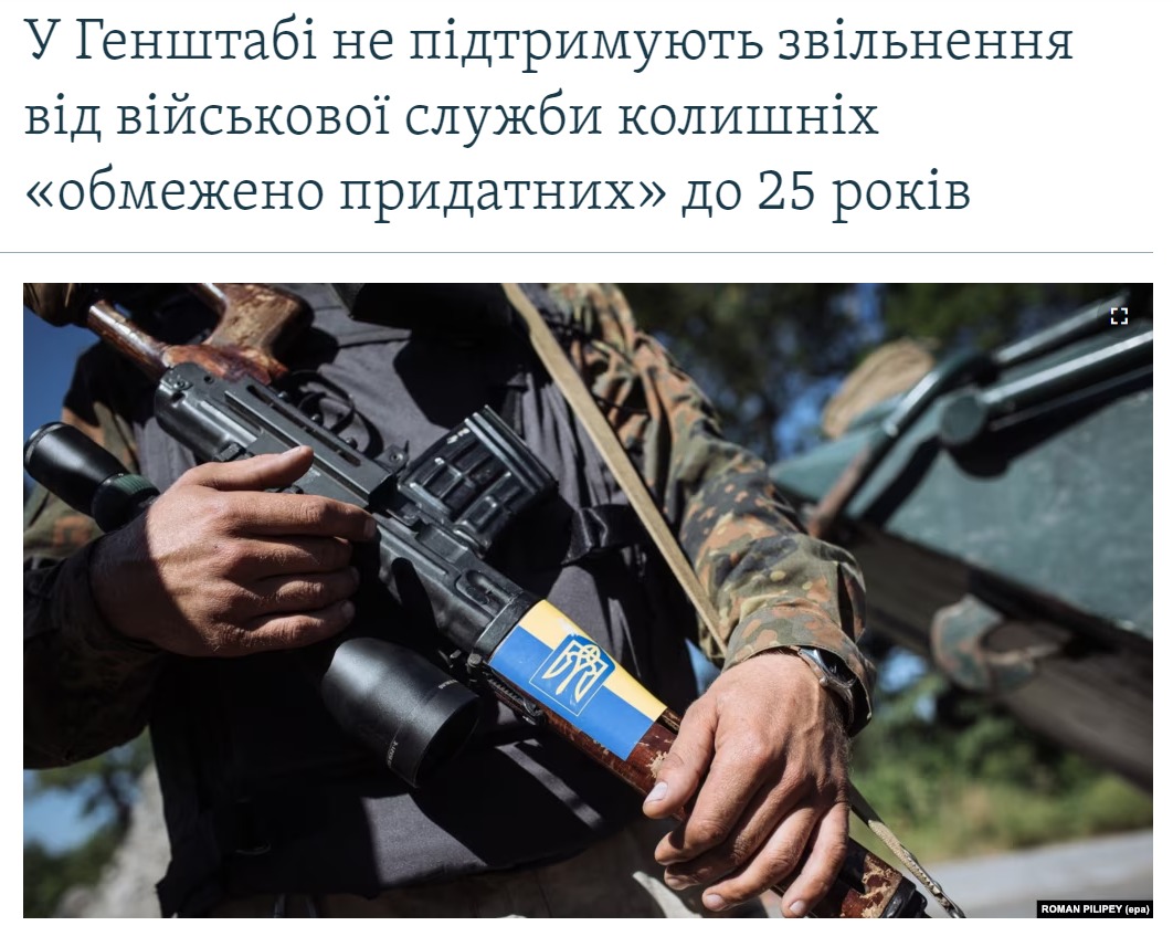 Генштаб ВСУ не поддержал законопроект, которым предлагалось освободить от мобилизации мужчин до 25 лет, ранее освобожденных от службы в мирное время, однако имевших статус ограниченно пригодных для службы в военное время.