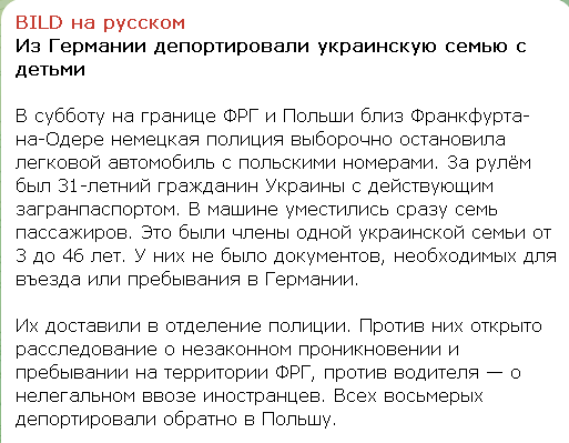 По данным издания, в субботу немецкая полиция на границе ФРГ и Польши остановила автомобиль с польскими номерами. За рулём был 31-летний гражданин Украины с действующим загранпаспортом. Всего в машине находились семь пассажиров: члены одной украинской семьи в возрасте от 3 до 46 лет. У них не было документов, необходимых для въезда в Германию или пребывания в стране. Поэтому их доставили в отделение полиции, а затем депортировали обратно в Польшу.