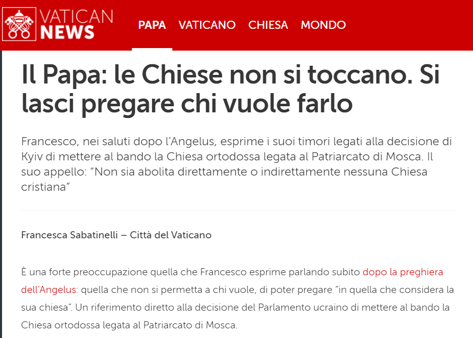 Папа римский Франциск, комментируя украинский закон, который делает возможным запрет Украинской православной церкви (УПЦ) в Украине, призвал "не запрещать ни одну христианскую церковь прямо или косвенно".