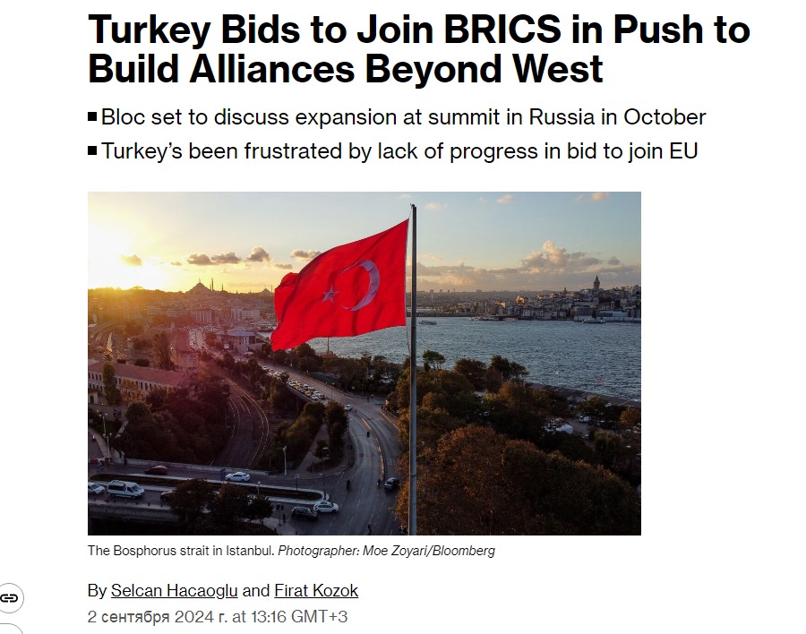 Турция подала заявку на присоединение к БРИКС еще несколько месяцев назад на фоне разочарования из-за отсутствия прогресса в ее десятилетней заявке на вступление в Европейский союз, добавили собеседники агентства. Эта заявка также частично является результатом разногласий с другими членами НАТО после того, как Турция поддерживала тесные связи с Россией после ее вторжения в Украину.