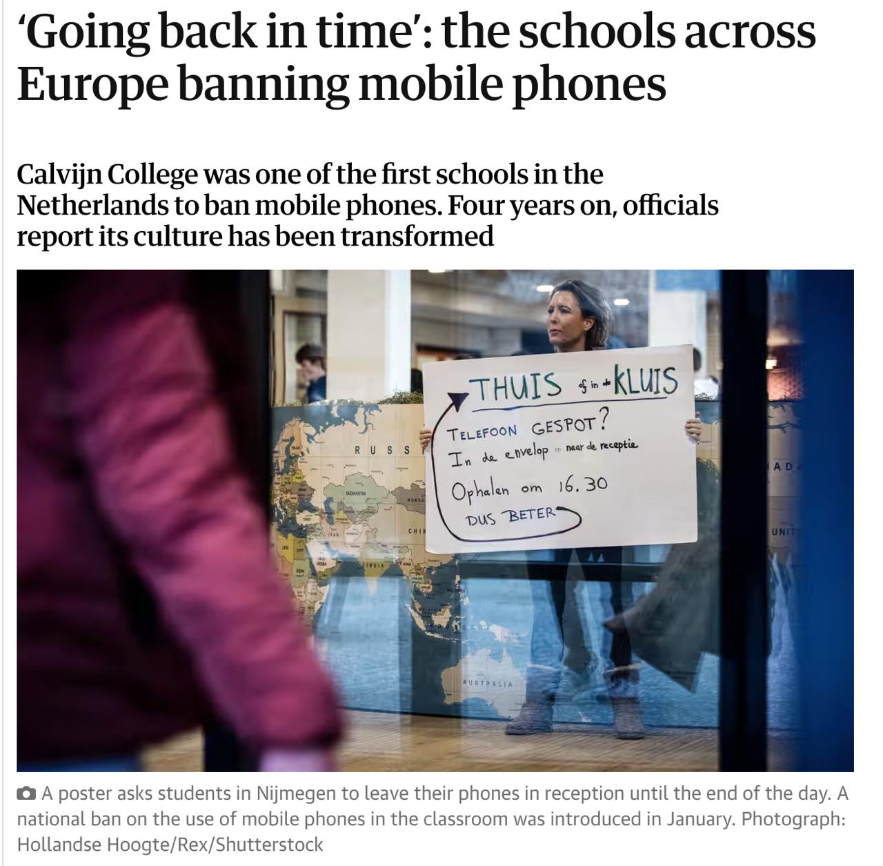Первым был Calvijn College в Нидерландах почти четыре года назад, а теперь примеру следуют многие другие школы страны, а также Франции и Бельгии. В Венгрии даже приняли отдельный закон, требующий сдавать телефоны и смарт-устройства в начале учебного дня. Италия и Греция разрешили носить с собой телефоны, но запретили их использование в классах. В России с 1 сентября этого года также введён запрет.