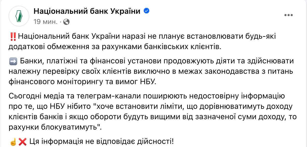 Позже Нацбанк заявил, что "на данный момент" не планирует устанавливать дополнительные ограничения по банковским счетам украинцев.