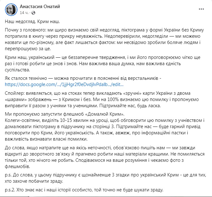 "Наше упущение. Крым наш. Начну с главного: мы искренне признаем свое упущение, пиктограмма в форме Украины без Крыма попала в книгу из-за досадной невнимательности. Недопроверили, недосмотрели — мы можем назвать это по-разному, но факт остается фактом: мы бессознательно сделали больно людям и извиняемся за это. Крым наш, украинский — это безоговорочное утверждение, и мы его проговариваем четко еще раз и готовы делать это снова и снова... Оказывается, что на стоках теперь выкладывают "удобные" карты с двумя слоями изображений — с Крымом и без", - объяснила Онатий.