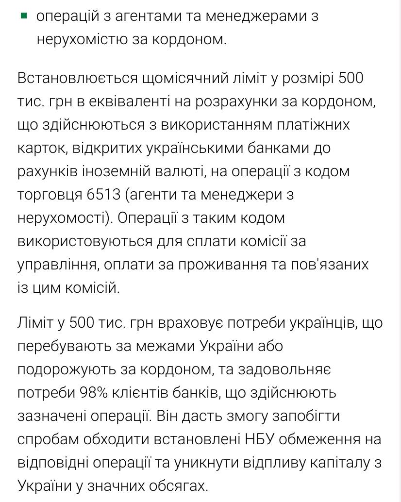 Также устанавливается ежемесячный лимит в размере 500 тыс. грн в эквиваленте на расчеты за рубежом, осуществляемые с использованием платежных карточек, открытых украинскими банками к счетам иностранной валюте, на операции с кодом торговца 6513 (агенты и менеджеры по недвижимости). Операции с таким кодом используются для оплаты комиссии за управление, оплаты за проживание и связанных с этим комиссий. Лимит в 500 тыс. грн учитывает потребности украинцев, находящихся за пределами Украины или путешествующих за границей, и удовлетворяет потребности 98% клиентов банков, осуществляющих указанные операции, заверили в НБУ. Он позволит предотвратить попытки обходить установленные НБУ ограничения на соответствующие операции и избежать оттока капитала из Украины в значительных объемах, заявили в НБУ.