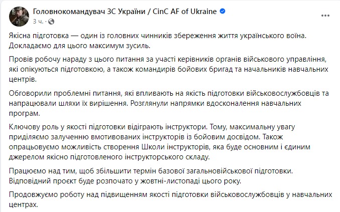 "Провел рабочее совещание по этому вопросу с участием руководителей органов военного управления, которые занимаются подготовкой, а также командиров боевых бригад и начальников учебных центров. Обсудили проблемные вопросы, влияющие на качество подготовки военнослужащих и наработавшие пути их решения. Рассмотрели направления усовершенствования учебных программ. Ключевую роль в качестве подготовки играют инструкторы. Поэтому максимальное внимание уделяем привлечению мотивированных инструкторов с боевым опытом. Также прорабатываем возможность создания Школы инструкторов, которая станет основным и единственным источником качественно подготовленного инструкторского состава", - сказано в публикации.
