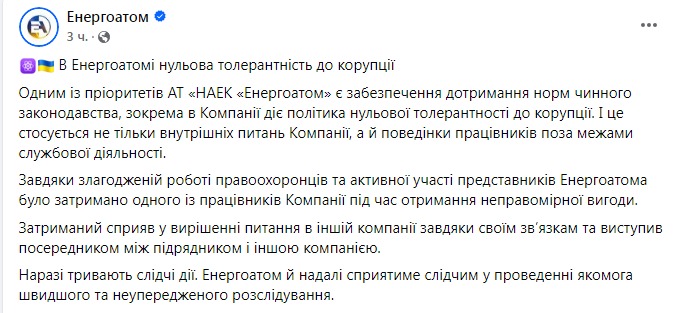 "Энергоатом" уже подтвердил задержание своего менеджера и заявил, что он, пользуясь своими связями, выступил посредником между подрядчиком НАК и другой компанией.