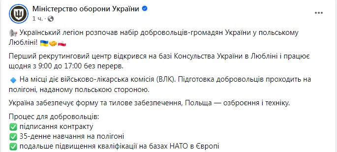 В польском Люблине на базе украинского консульства открыли первый рекрутинговый центр для набора добровольцев в Украинский легион.