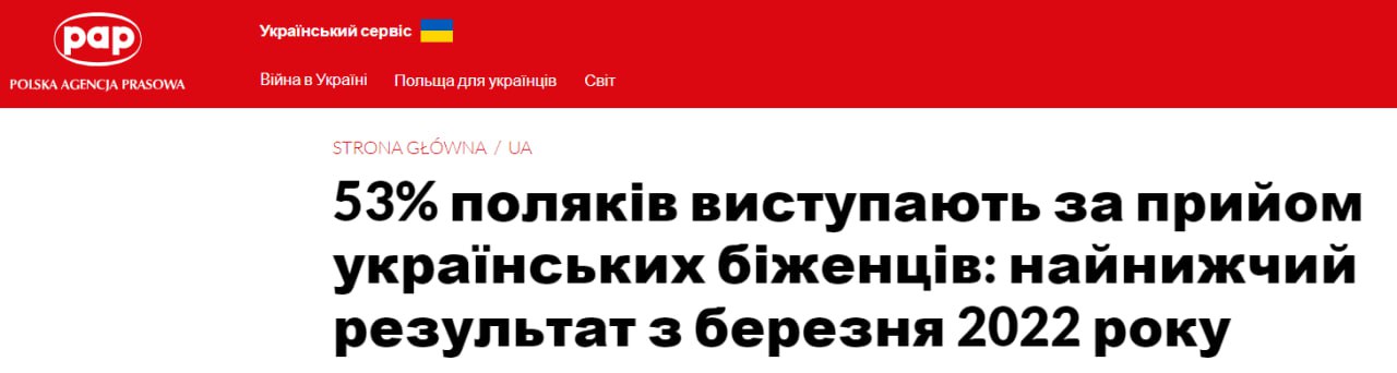 За приём украинских беженцев в Польше высказались 53% опрошенных. И это самый низкий результат с марта 2022 года, отмечает агентство.