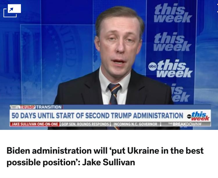 «Мы собираемся сделать все, что в наших силах, в течение этих 50 дней, чтобы предоставить Украине все возможные инструменты для укрепления ее позиций на поле боя, чтобы она была сильнее за столом переговоров. И президент Байден поручил мне следить за массовыми поставками военной техники, которую мы отправляем в Украину, чтобы мы потратили каждый доллар, который Конгресс выделил нам, к тому времени, когда президент Байден покинет свой пост», — сказал Салливан.