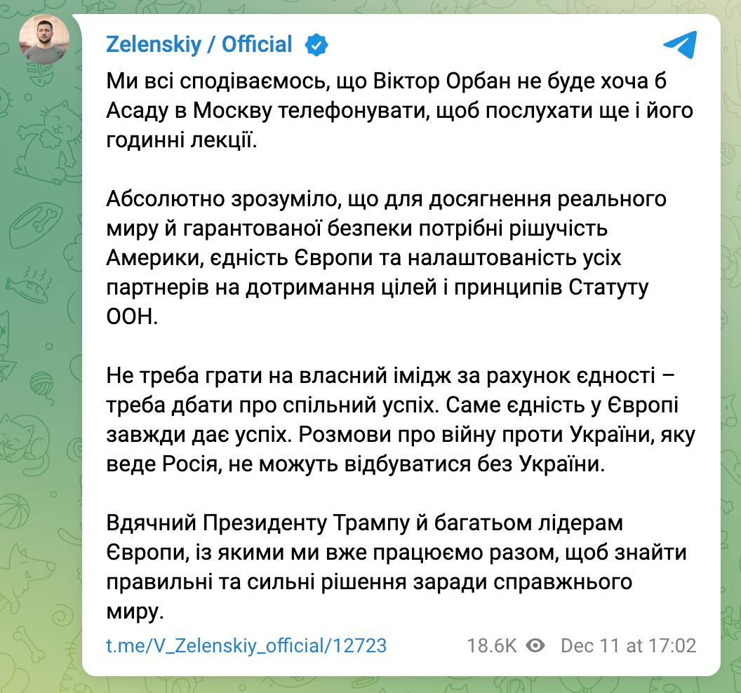 "Мы все надеемся, что Виктор Орбан не будет хотя бы Асаду в Москву звонить по телефону, чтобы послушать еще и его часовые лекции. Не нужно играть на собственный имидж за счет единства – нужно заботиться об общем успехе. Разговоры о войне против Украины, которую ведет Россия, не могут происходить без Украины", - написал украинский президент.