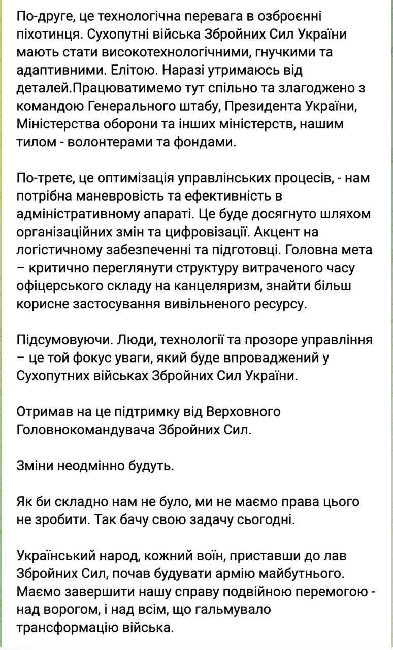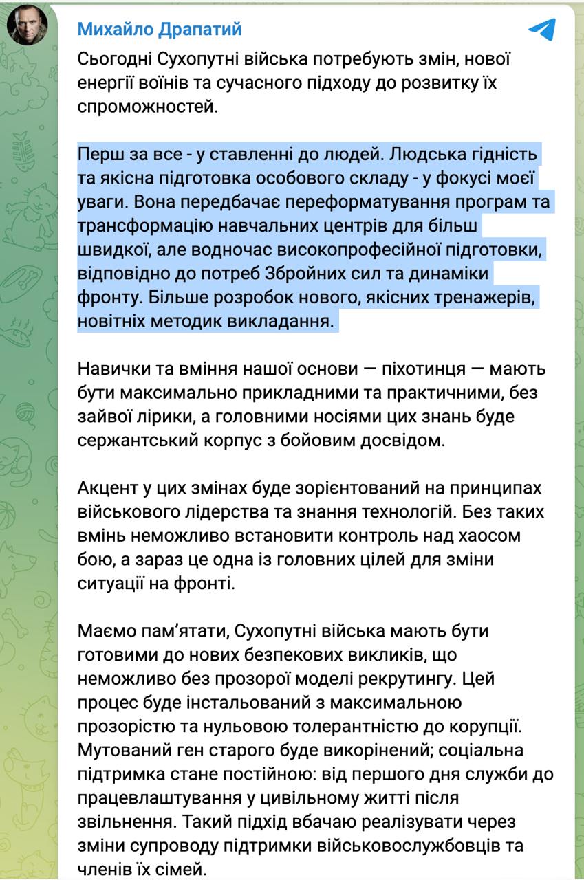 Об этом сообщил в своем телеграм-канале новый командующий Сухопутными войсками Михаил Драпатый.