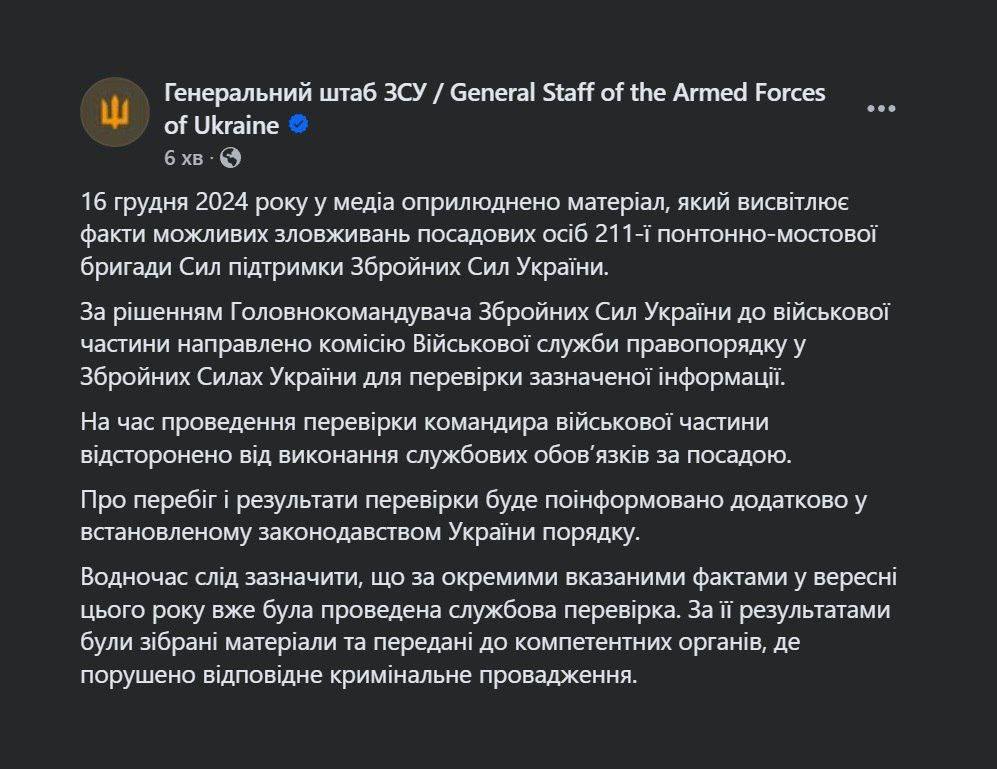 После публикации в СМИ галвком ВСУ Александр Сырский отстранил командира 211-й бригады, о чем сообщил Генштаб, отмечая, что отдельные факты уже были предметом проверки и открыто уголовное производство.