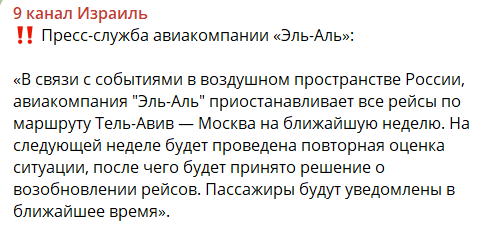 Израильская авиакомпания El-Al отменяет все рейсы в Москву после инцидента с азербайджанским самолетом, который разбился в Казахстане.