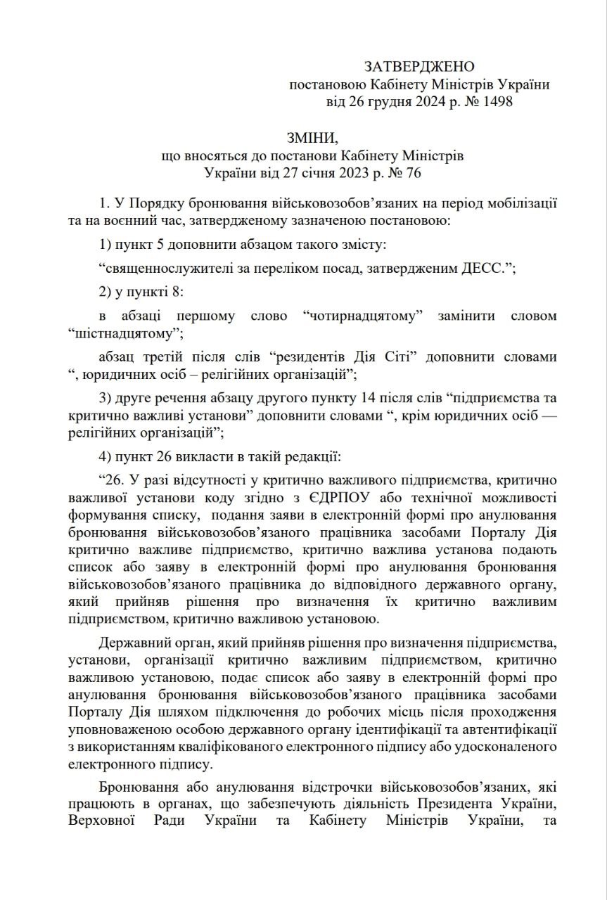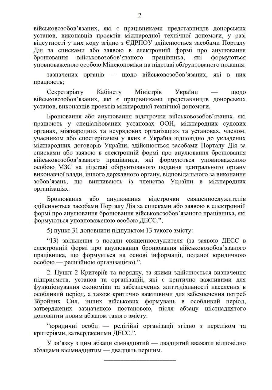 Кабинет министров разрешил бронировать от мобилизации священнослужителей без ограничений по количеству и требований к зарплате. Таким образом правительство приравняло священнослужителей к конечным владельцам критически важных для экономики в военный период предприятий, членам наблюдательных советов и работникам зарубежных дипломатических учреждений.