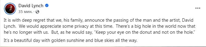 "С глубоким сожалением мы, его семья, сообщаем о кончине человека и художника Дэвида Линча. Мы были бы признательны за небольшое уединение в это время. Теперь, когда его больше нет с нами, в мире образовалась большая дыра. Но, как он сказал бы: "Следите за пончиком, а не за дыркой", - сказано в публикации.