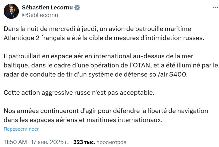 "Он патрулировал международное воздушное пространство над Балтийским морем в рамках операции НАТО и был освещен радаром управления огнем наземной/зенитной системы С-400", – написал Лекорню.