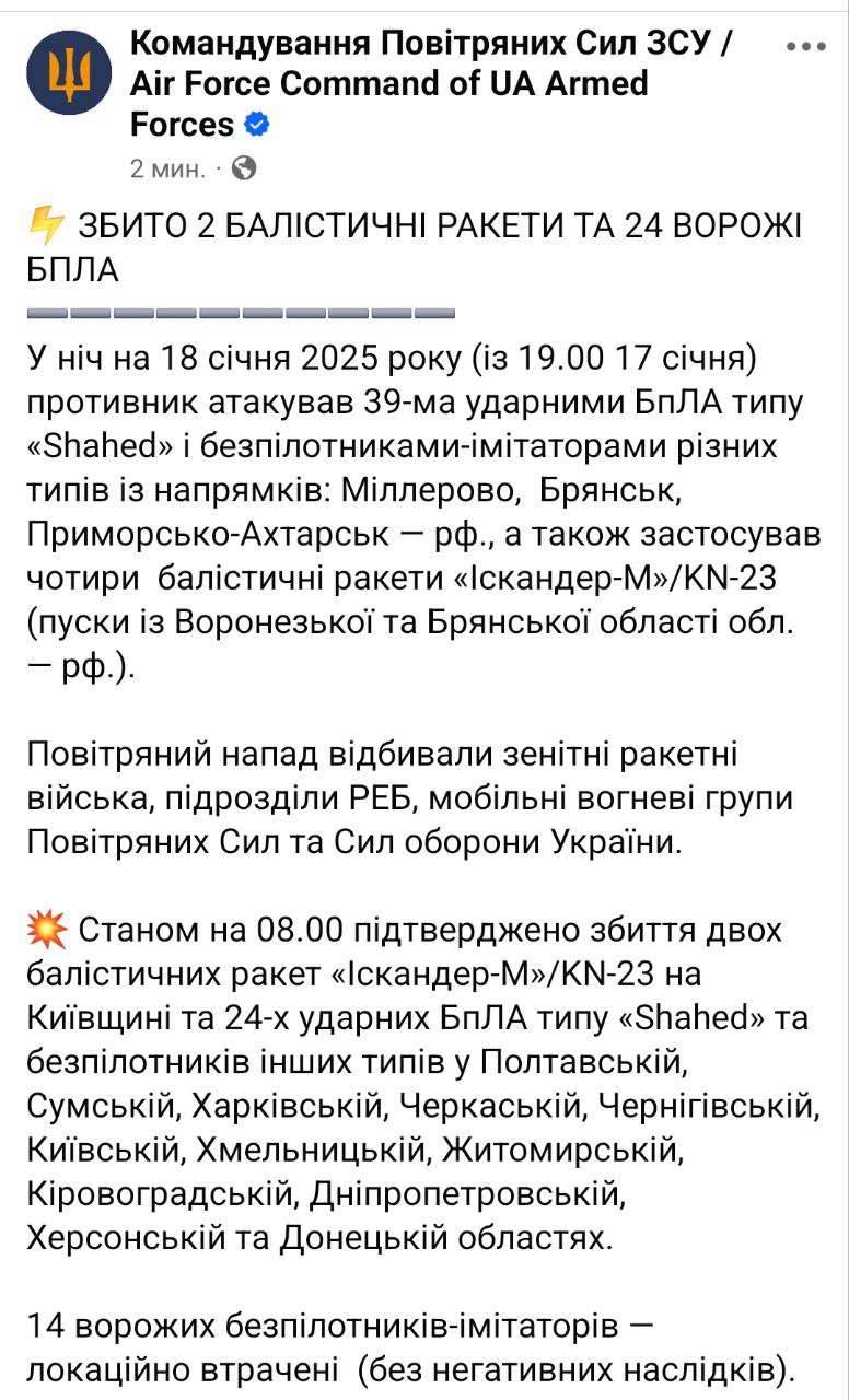 В Воздушных силах ВСУ сообщили, что Россия запустила по Украине четыре "Искандера" (либо его северокорейского аналога KN).