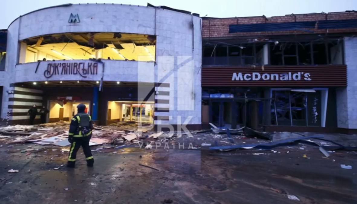 Ещё кадры разрушений на метро "Лукьяновская" и "Макдональдсе" в Киеве после обстрела.