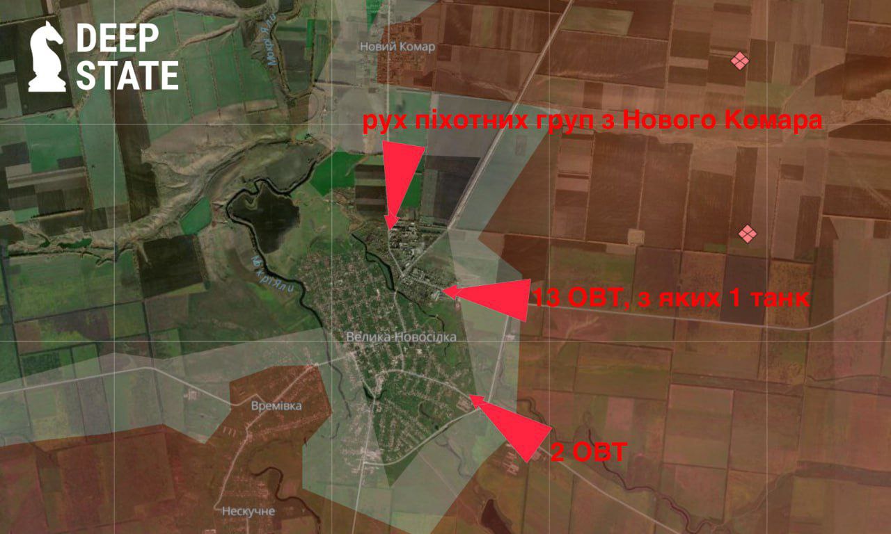 В свою очередь украинский военный телеграм-канал Deep State сообщает, что россияне начали штурм Великой Новосёлки с трёх направлений.