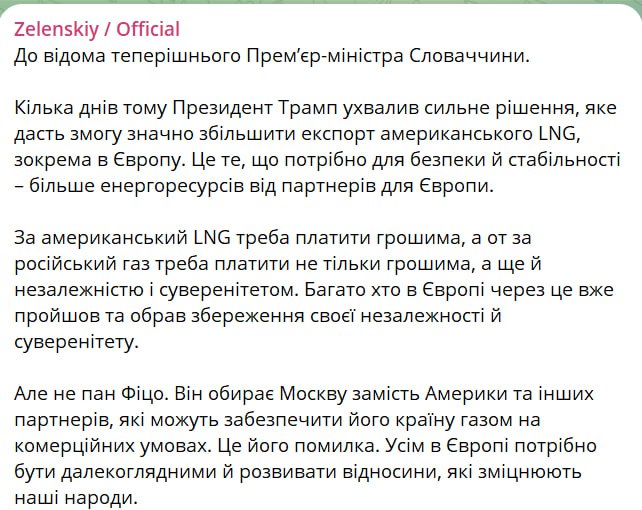По словам украинского президента, Фицо "выбирает Москву вместо Америки и других партнеров, которые могут обеспечить его страну газом на коммерческих условиях".