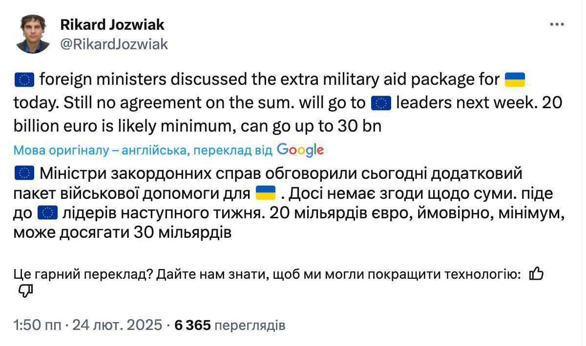 Тем временем министры иностранных дел ЕС обсудили выделение Украине еще 20-30 миллиардов евро военной помощи, сообщил журналист "Радио Свобода" Рикард Йозвяк.