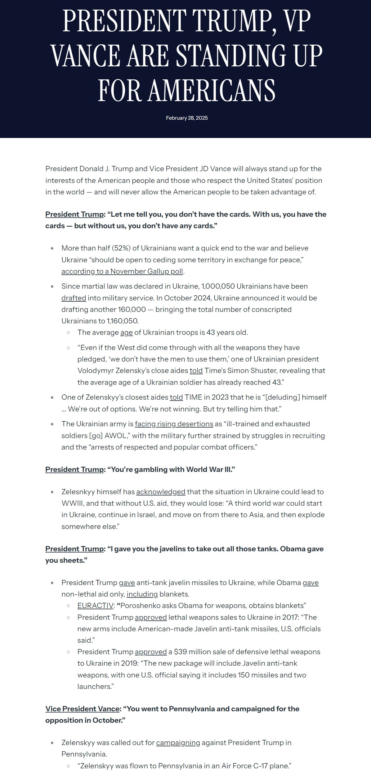 Белый дом выпустил официальное заявление, в котором привел аргументы в поддержку президента США Дональда Трампа и вице-президента Джея Ди Вэнса после встречи с Владимиром Зеленским.