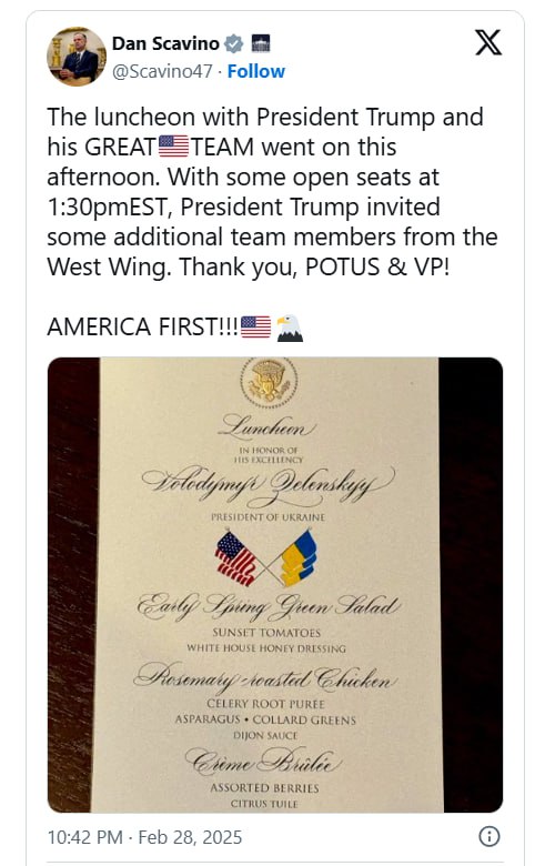 Фотография меню была опубликована в X заместителем руководителя аппарата Белого дома Дэном Скавино.