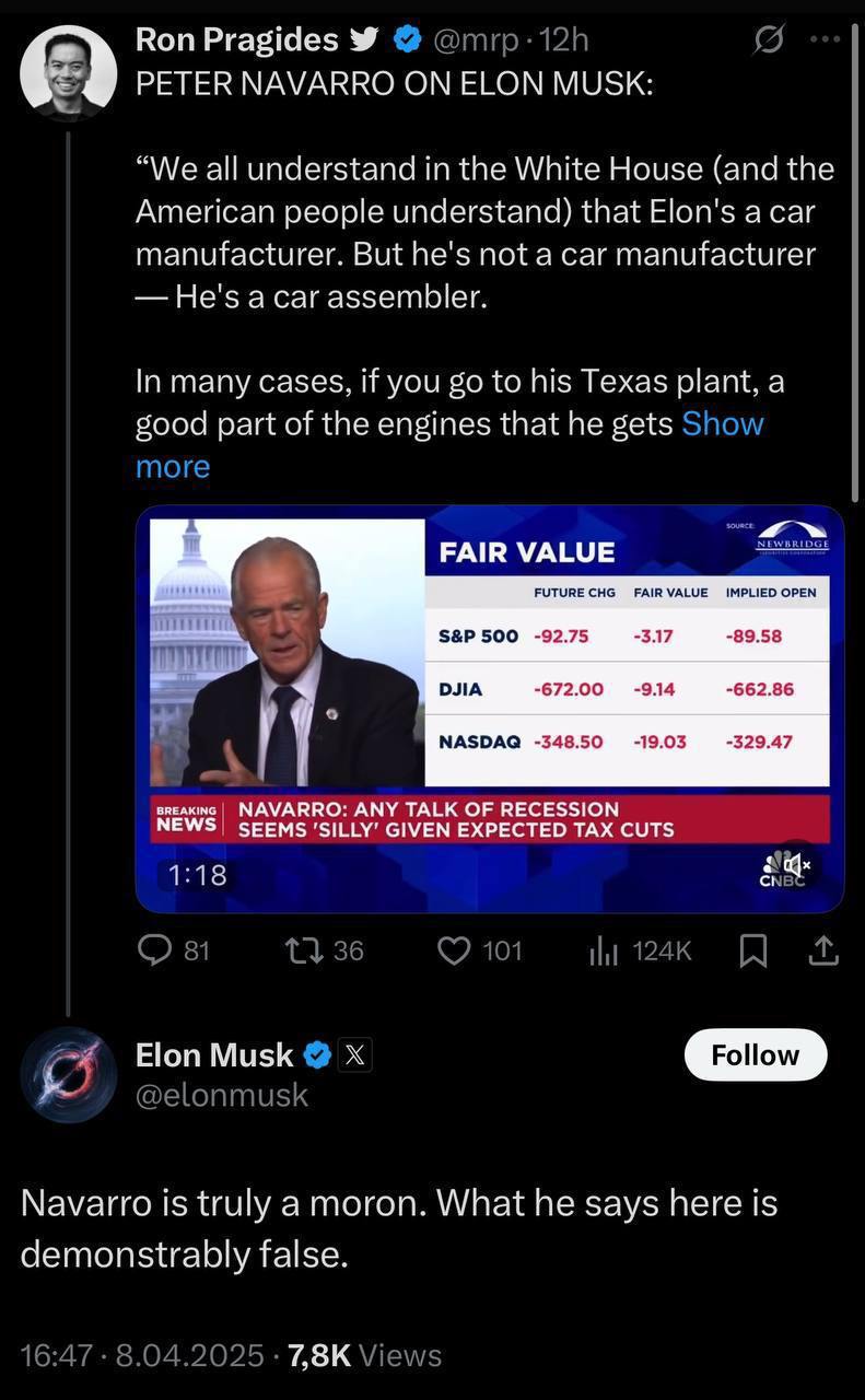 "Наварро действительно идиот. То, что он здесь говорит, является явно ложным. Он тупой как пробка", - заявил Маск.