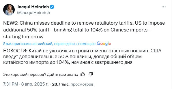 Напомним, вчера вечером Трамп заявил, что США введут дополнительные 50%-е тарифы на китайский импорт, если Пекин не отменит свои 34%-е пошлины на американский импорт, которые ввел в ответ на недавние пошлины Вашингтона.