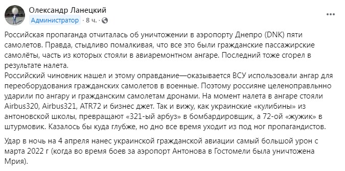 Также Ланецкий сообщает, что летом 2023 года в результате ракетных обстрелов аэропорта Жуляны (Киев) были повреждены 2 Airbus 320 одной из украинских авиакомпаний.