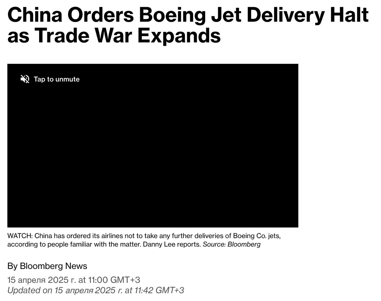 Указания насчет самолетов Пекин сделал после того, как объявил о введении пошлин в размере 125% на американские товары в ответ на действия Вашингтона, который повысил свои тарифы в отношении Китая до 145%. Как сказали собеседники агентства, пошлины сами по себе более чем вдвое увеличили бы цену самолетов и деталей американского производства, поэтому китайским авиакомпаниям стало "нецелесообразно принимать Boeing".