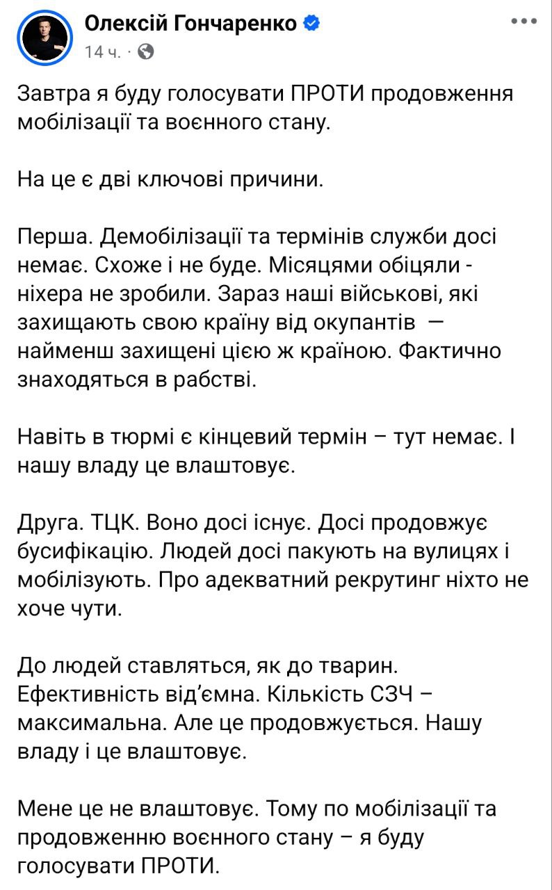 "Есть две ключевые причины. Первая. Демобилизации и сроков службы до сих пор нет. Похоже, и не будет. Месяцами обещали – них@ра не сделали. Сейчас наши военные, защищающие свою страну от оккупантов, наименее защищены этой же страной. Практически находятся в рабстве. Даже в тюрьме есть конечный срок – здесь нет. И нашу власть это устраивает. Вторая. ТЦК. Они до сих пор существуют. До сих пор продолжают бусификацию. Людей до сих пор упаковывают на улицах и мобилизуют. Об адекватном рекрутинге никто не хочет слышать. К людям относятся как к животным. Эффективность отрицательная. Количество СОЧ (самовольное оставление части, СЗЧ - укр. - Ред.) – максимальное. Но это продолжается. Наши власти и это устраивает. Меня это не устраивает. Поэтому по мобилизации и продлению военного положения – я буду голосовать против", - заявил Гончаренко.