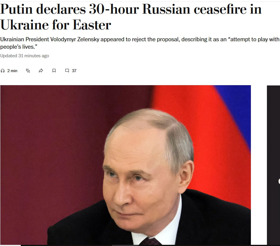 Издание The Washington Post сообщило, что Путин объявил о 30-часовом перемирии, но Зеленский, судя по всему, отверг его.