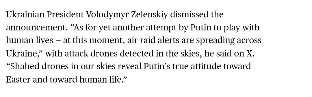 "Российский лидер заявил, что ожидает, что Украина последует примеру России, и добавил, что реакция Киева покажет, насколько серьезно он стремится к мирному урегулированию войны. Президент Украины Владимир Зеленский, судя по всему, отверг это предложение в субботу, назвав его "попыткой играть жизнями людей", – пишет издание.