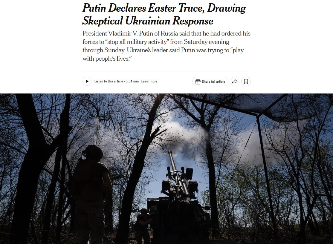 Тем временем газета The New York Times считает, что Россия продемонстрировала открытость к переговорам, объявив пасхальное перемирие.