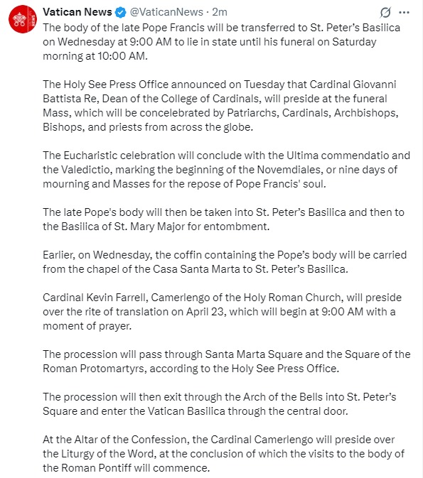 Тело покойного папы римского Франциска будет перенесено в собор Святого Петра в среду в 9:00 утра, где оно будет выставлено для прощания до его похорон в субботу утром в 10:00 утра.