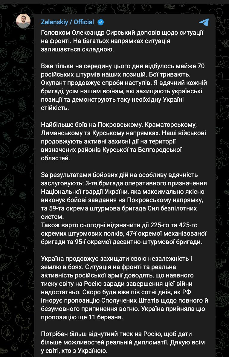 "Больше всего боев на Покровском, Краматорском, Лиманском и Курском направлениях. Наши военные продолжают активные защитные действия на территории обозначенных районов Курской и Белгородской областей", - говорится в сообщении.